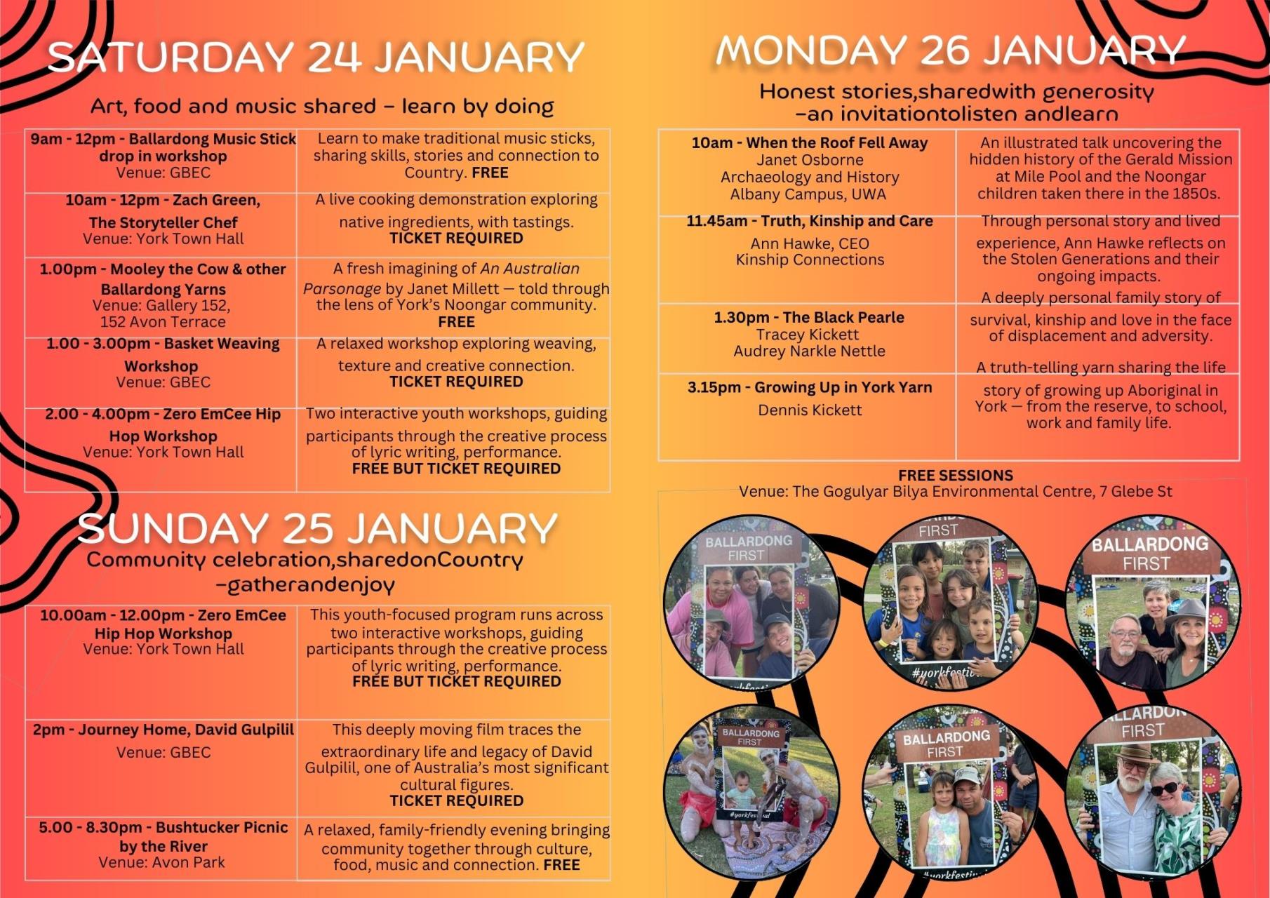 Ballardong First is a community-led celebration of Ballardong Noongar culture, created by Ballardong community members and supported by Wheatbelt Arts & Events Inc.