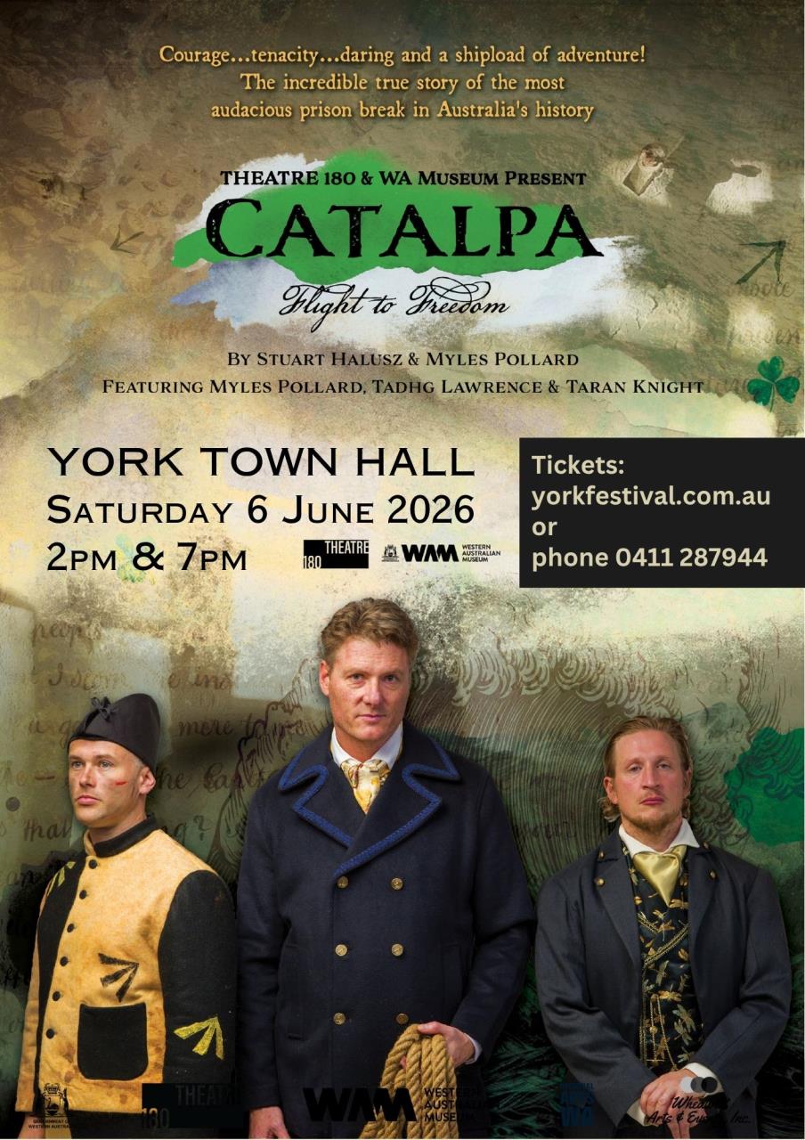 The York Festival is proud to present CATALPA: Flight to Freedom — a powerful, professionally produced, Theatre 180 work arriving at York Town Hall on Saturday 6 June. This gripping production tells the incredible true story of the rescue in 1876 of six Fenian prisoners from Fremantle Prison in the most daring and audacious prisonbreak in Australia’s history.