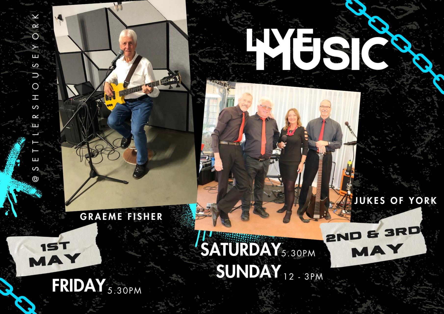 Live Entertainment - Settlers House Friday 1st May 2026 (Multiple Dates Between Friday 1st May 2026 & Sunday 3rd May 2026) Event Details Time: Various Times Address: 125 Avon Tce York Venue Settlers House Tavern Cost: Free Category: General Type: General Audience: All Ages Enquiries Contact: Stacey Slater Organisation: Settles House York Position: General Manager Phone: 08 69641 1884 Email: settlershouseyork@westnet.com.au Website: https://www.facebook.com/Settlershouseyork Event Date(s) Friday, 01 May 2026 | 5:30PM - 9:00PM Saturday, 02 May 2026 | 5:30PM - 9:00PM Sunday, 03 May 2026 | 12:00PM - 3:00PM Back to All Events