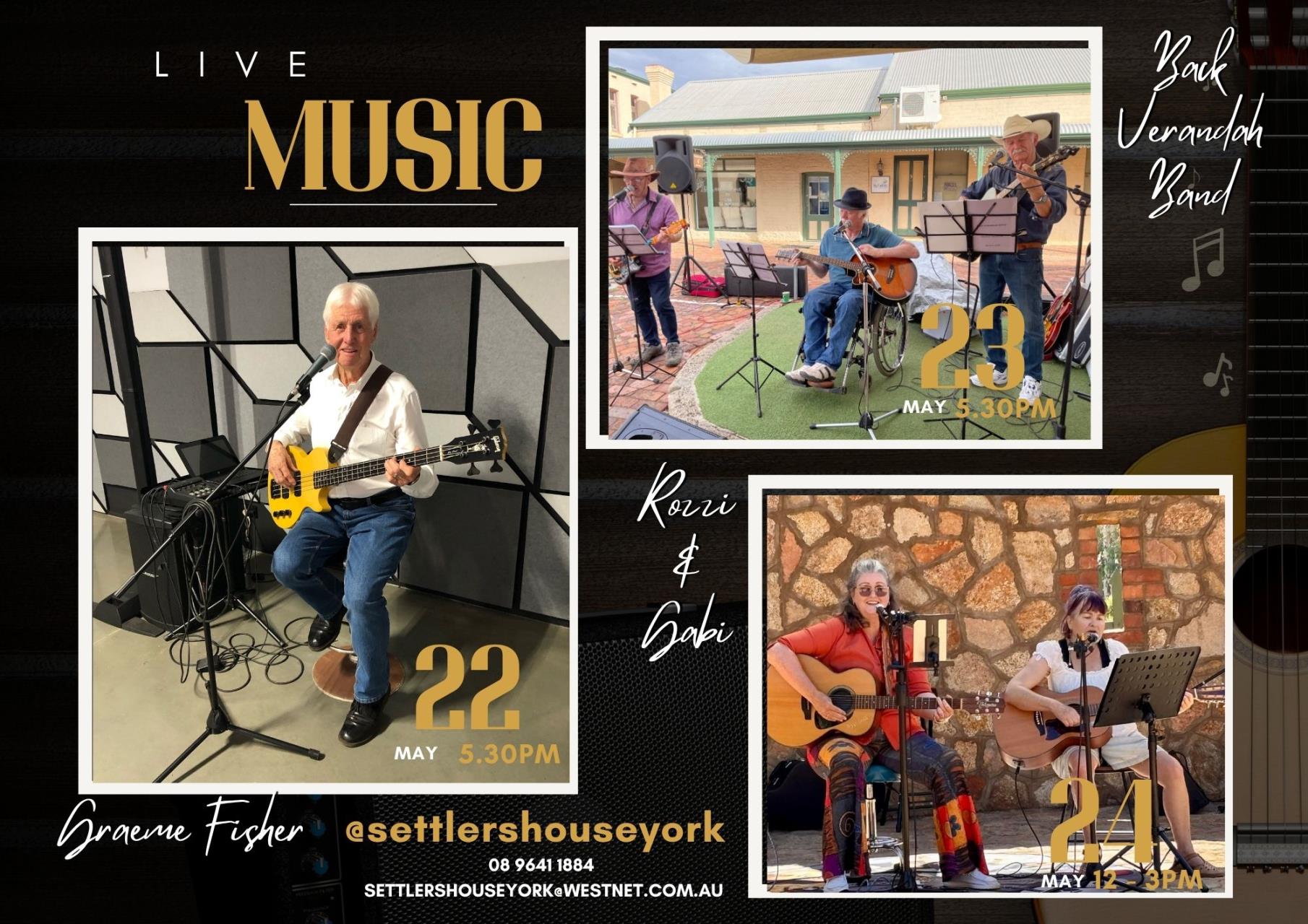 Live Entertainment - Settlers House Friday 22nd May 2026 (Multiple Dates Between Friday 22nd May 2026 & Sunday 24th May 2026) Event Details Time: Various Times Address: 125 Avon Tce York Venue Settlers House Cost: Free Category: General Type: General Audience: All Ages Enquiries Contact: Stacey Slater Organisation: Settles House York Position: General Manager Phone: 08 69641 1884 Email: settlershouseyork@westnet.com.au Website: https://www.facebook.com/Settlershouseyork Event Date(s) Friday, 22 May 2026 | 5:30PM - 8:30PM Saturday, 23 May 2026 | 5:30PM - 8:30PM Sunday, 24 May 2026 | 12:00PM - 3:00PM Back to All Events