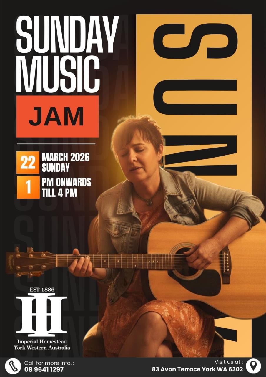 Sunday Music Jam Sunday 22nd March 2026 Event Details Time: 1pm - 4pm Address: 81 Avon Terrace, York Venue Imperial Homestead Cost: Free Category: General Type: General Audience: All Ages Enquiries Organisation: Imperial Homestead Phone: 0450 401 000 Email: enquiries@imperialhomestead.com.au Website: https://www.imperialhomestead.com.au/index.html Event Date(s) Sunday, 22 March 2026 | 1:00PM - 4:00PM Back to All Events