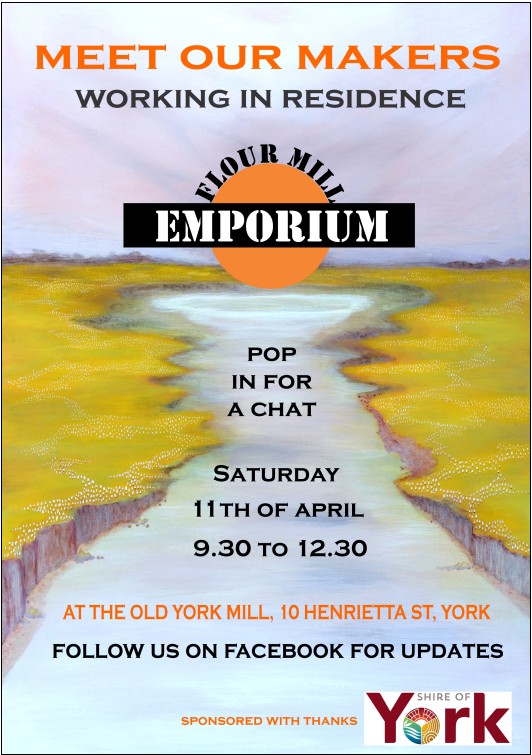 The Flour Mill Emporium - Meet Our Makers working in residence. Saturday 11th April 2026 Event Details Time: 9.30AM - 12.30PM Address: 10 Henrietta Street, York WA Venue Flour Mill Emporium Category: General Type: General Audience: All Ages Enquiries Contact: Sharon Organisation: Flour Mill Emporium Position: Event Organiser Phone: 0428 751 412 Email: supermoonapril21@gmail.com.au Event Date(s) Saturday, 11 April 2026 | 9:30AM - 12:30PM Back to All Events