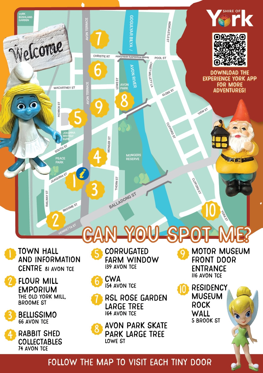 Tiny Doors of York 2026 Thursday 2nd April 2026 to Friday 2nd April 2027 Download Tiny Doors Trail Map Here Event Details Location Various locations around York Cost: Free Category: General Type: General Audience: All Ages Enquiries Contact: York Visitor Centre Organisation: Shire of York Phone: 08 9641 1301 Email: info@york.wa.gov.au Website: visit.york.wa.gov.au Event Date(s) Thursday, 02 April 2026 | 12:00AM - 12:00AM Back to All Events