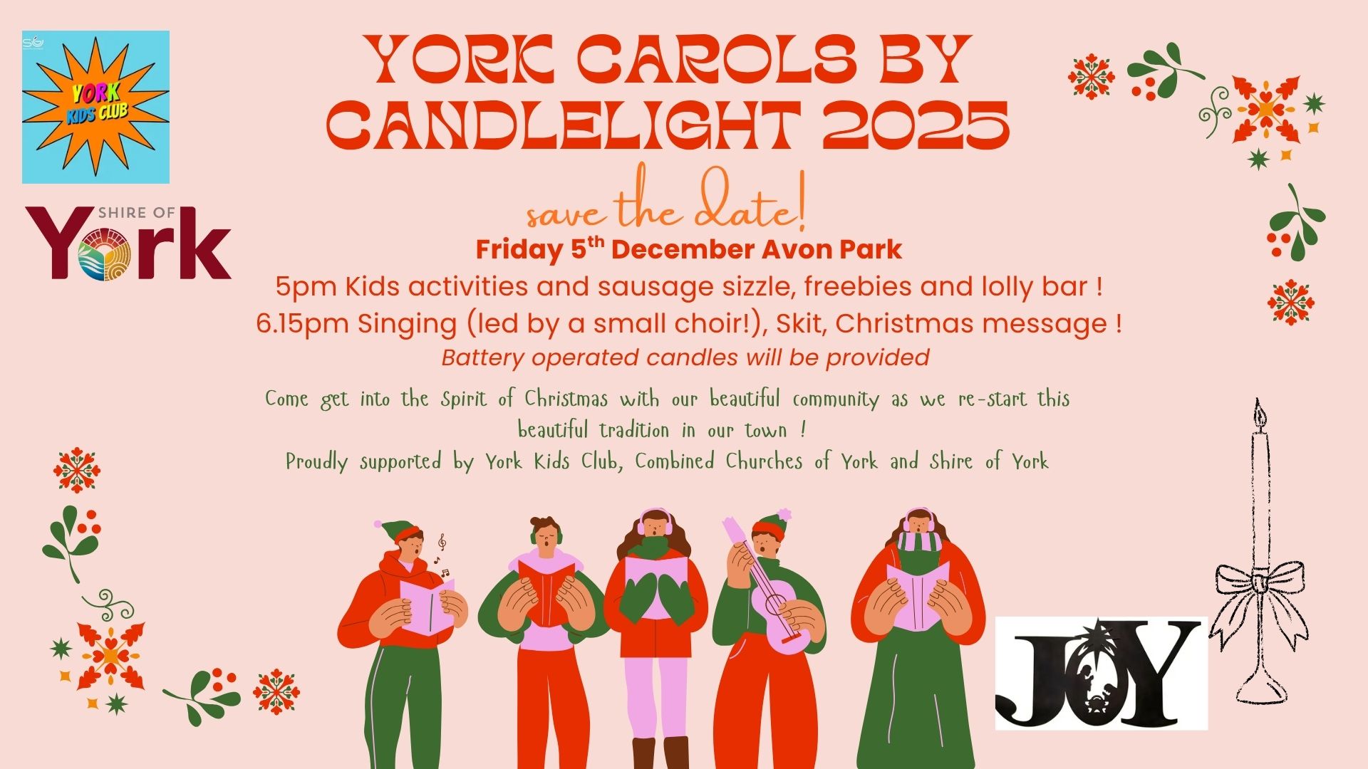 York Carols by Candlelight 2025 - Save the Date - Friday 5th December 2025 Friday 5th December 2025 Event Details Time: 5PM Location: Avon Park Venue: Avon Park Cost: Free Category: General Type: General Audience: All Ages Enquiries Organisation: York Kids Club, Combined Churches of York, Shire of York Website: https://visit.york.wa.gov.au/events/ Event Date(s) Friday 5th December 2025 Back to All Events