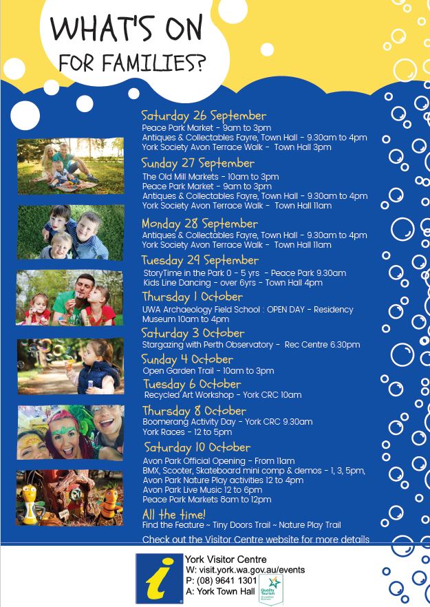 Family activities in York for the school holidays Published on Sunday, 27 September 2020 at 11:04:54 AM York offers an array of family-friendly activities these school holidays. For a downloadable map, please click here. Back to All News